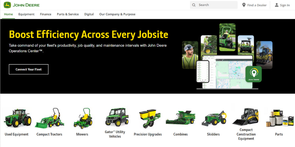 John Deere使用AI技术,把辨识导入农机的设备中,农业机器可以在农作行进间,自动区分哪些是杂草哪些是农作物,针对杂草精准喷药而且不会伤害到浓作物,协助农民降低农药成本并同时提升收成品质,John Deere从贩售硬体转型成为提供农业数据服务的科技公司。