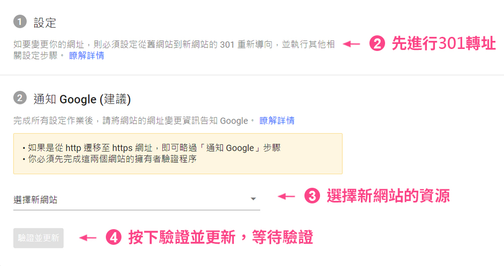 若要將 https://xxx.com/ 移到 http://yyy.com,首先會需要維持https://xxx.com/ 運作,並且在Search Console 新增 http://yyy.com 的資源,之後再將 https://xxx.com/ 所有網頁資料301轉址到 http://yyy.com,進入變更網址功能,選擇新網站的資源,並等待驗證通過即可完成。